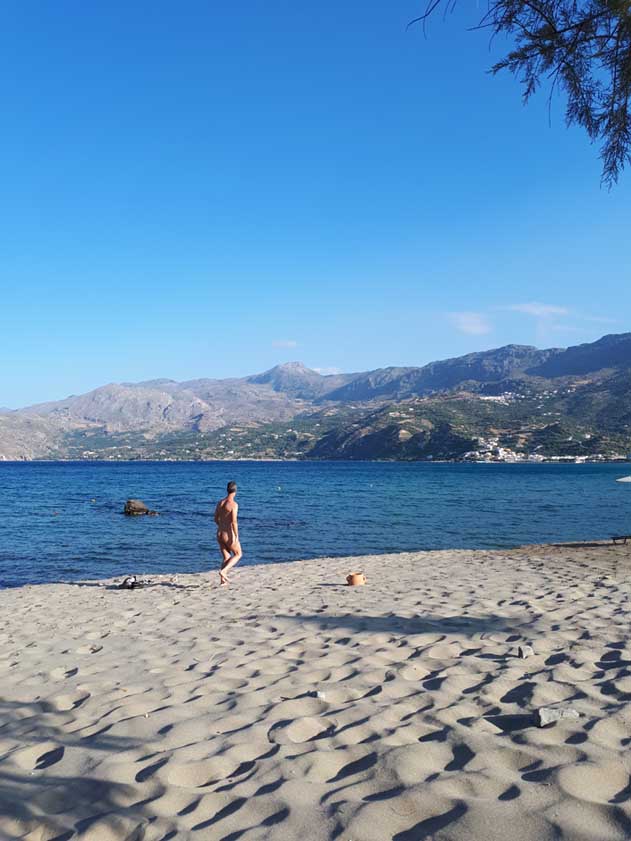 Plage de Agio Pavlos juste à l'est de Triopetra. Depuis le village, prendre l'escalier au bout de la plage textile puis passer par dessus la première plage. Descente dans une pente en sable brûlant (vraiment brûlant, prévoir des chaussures) pour rejoindre une magnifique plage de plus de 1 km. C'est vrai, il faut un peu marcher, mais du coup nous étions 7 pour 1 km de plage alors que la plage textile était bondée.