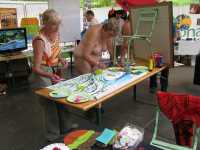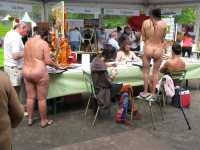 Quelques petites photos un peu pixellisées , devant le stand Apnel, séance de caricature avec julien (wicasa), conférence dépénalisation nudité, gaby de la sablière, stand FFN, dessin sur corps pour sylvie de dos et profil