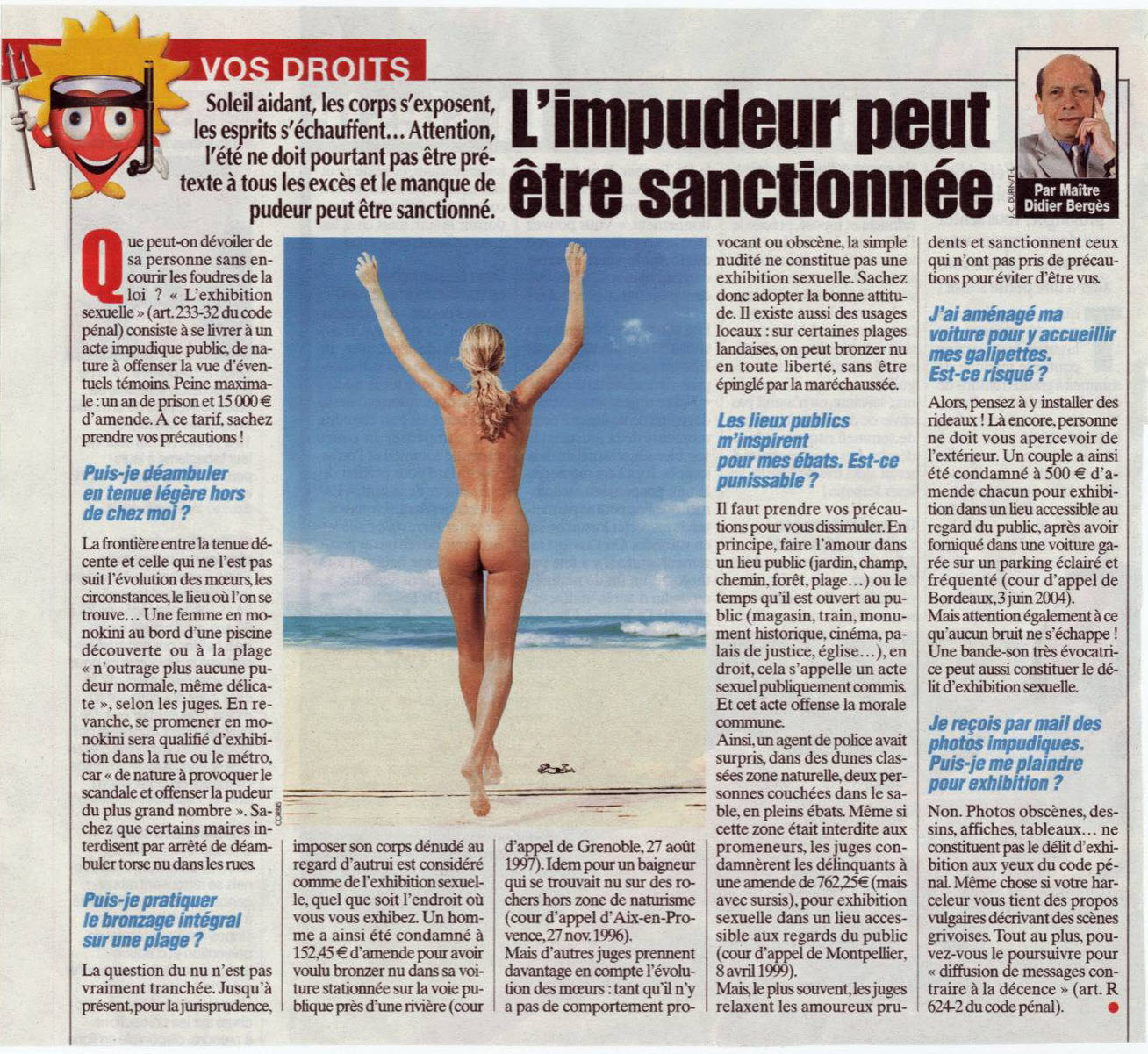 La mauvaise humeur de Tacbam est séduisante, mais, sérieusement, il ya heureusement beaucoup de pratiques libres qui ne sont pas pénalisées, et les gouvernements de pays voisins comme l'Espagne ne sont pas plus désintéressés que le nôtre. Ils sont sans doute simplement PLUS INTELLIGENTS ! Allons, tout espoir n'est peut-être pas perdu quand il suffirait, au fond, que la loi définisse plus précisément et objectivement la notion d'exhibition sexuelle, que les juges interprêtent aujourd'hui selon leur propre subjectivité.
