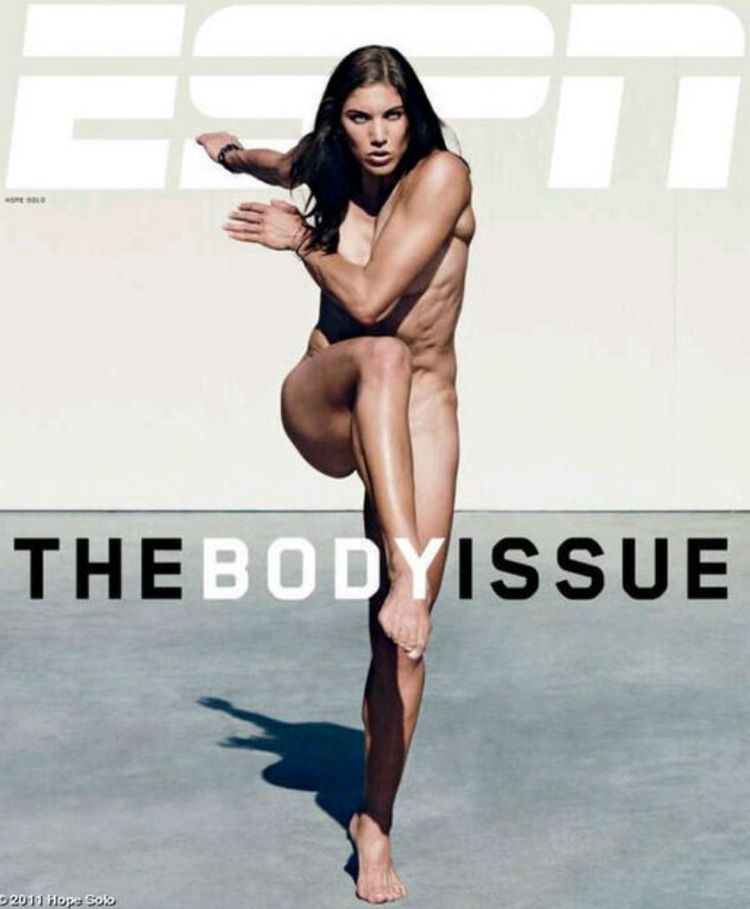 D'ailleurs cette parution de photos de sportifs dénudée existe chaque année et j'ai trouvée une petite interview et making of du tournage de la footballeuse américaine à http://footballfashion.org/wordpress/2011/10/06/hope-solo-in-espn-the-magazine-body-issue-2011/