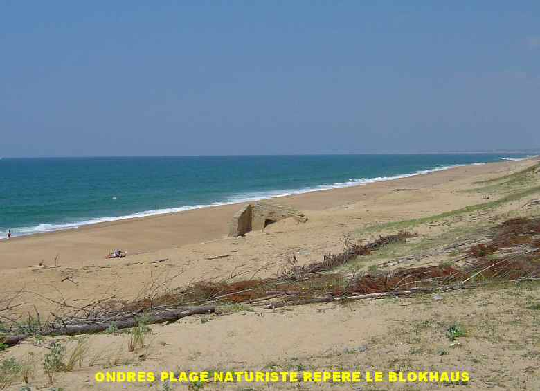 accès à pied par le chemin utilisé par les machines de nettoiement, franchir la dune, repère de la plage naturiste le blokhaus